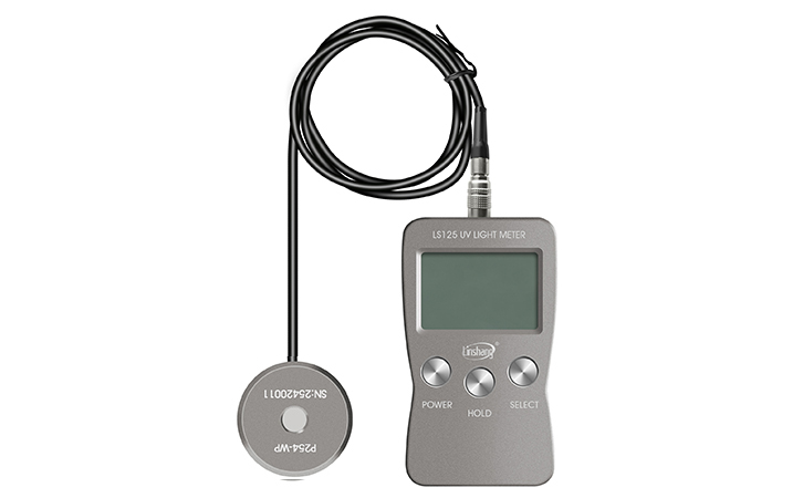 LS125+P254-WP紫外輻射照度計(jì)采用的是防水的數(shù)字探頭,其防水的深度可達(dá)1m,功率最大可測(cè)200000 uW/cm2,儀器采用插拔式設(shè)計(jì),并且探頭背附磁力可吸附在鐵板上,方便固定。為了防止其他光線的干擾,我們將信號(hào)放大的部分放入探測(cè)器的金屬盒里還使用了帶補(bǔ)正濾光鏡的專用檢測(cè)探頭。儀器可保存9組測(cè)量數(shù)據(jù),且關(guān)機(jī)后數(shù)據(jù)依然保存。