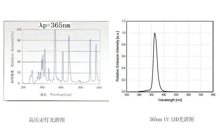 眾所周知,紫外固化用高壓汞燈在我國(guó)是有國(guó)家標(biāo)準(zhǔn)的,《QBT 2826-2006》膠印紫外光固化油墨國(guó)標(biāo),該標(biāo)準(zhǔn)中有規(guī)定:墨膜紫外固化條件:80W/cm2高壓水銀燈,照射距離15.5cm,速度64m/min。但是固化用的LED燈卻一直沒有出具國(guó)家標(biāo)準(zhǔn),很多企業(yè)還是在使用高壓汞燈專用的紫外能量計(jì)去測(cè)試LED光源,但是這種做法是非常不專業(yè)的。因?yàn)楦邏汗療艉凸袒肔ED燈的光譜曲線圖相差很多(見下圖),所以測(cè)試應(yīng)該使用固化用LED燈專用的紫外能量計(jì)。