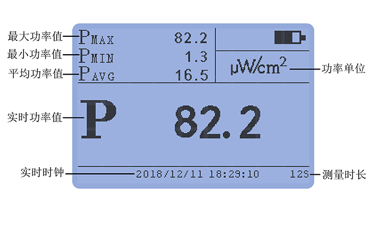 4.智能統(tǒng)計:測試時儀器會顯示測量功率的單位,最大值,最小值,平均值以及實時值,在屏幕的最下方還能顯示測量時長與日期