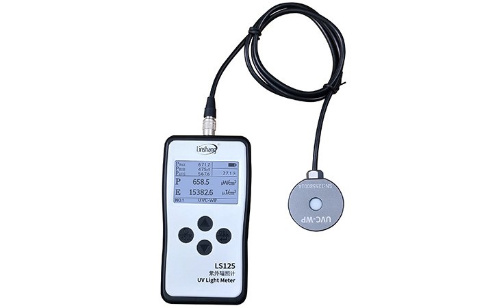 林上科技自主研發生產的LS125+UVC-WP紫外線強度檢測儀。這是專門為水處理殺菌燈所研發的一款探頭。探頭響應波長為230nm-280nm,具有防水功能,防水深度可達1米,還可以同時檢測出殺菌燈的強度及能量。同時量程高達0 - 200000 μW/cm2,可完美匹配水處理常用的大功率紫外殺菌燈進行檢測。
