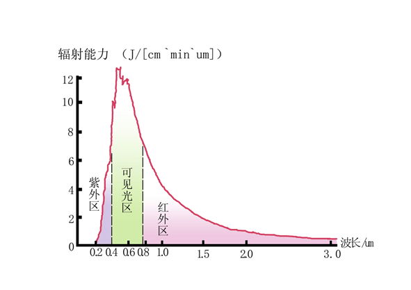 太陽光的極為寬闊的連續(xù)譜以及數(shù)以萬計(jì)的吸收線和發(fā)射線,是一個(gè)極為豐富的太陽信息寶藏。太陽光譜屬于G2V光譜型,有效溫度為5770 K。太陽電磁輻射中99.9% 的能量集中在紅外區(qū)、可見光區(qū)和紫外區(qū)。在地面上觀測(cè)的太陽輻射的波段范圍大約為0.295~2.5um。短于0.295um和大于2.5um波長的太陽輻射,因地球大氣中臭氧、水氣和其他大氣分子的強(qiáng)烈吸收,不能到達(dá)地面。